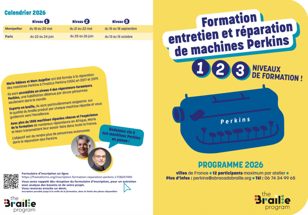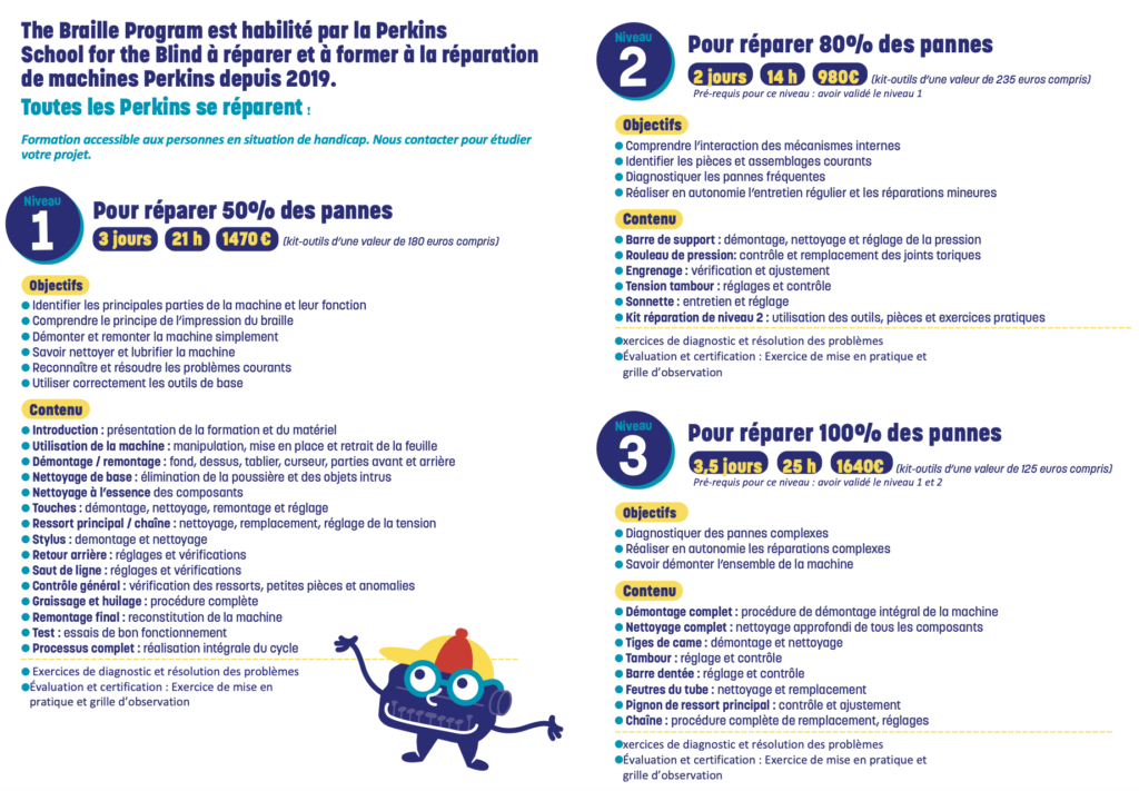 The Braille Program est habilité par la Perkins School for the Blind à réparer et à former à la réparation de machines Perkins.